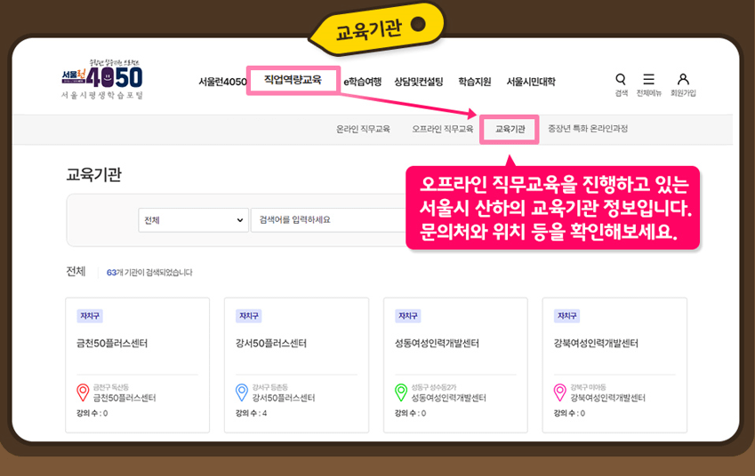 서울런 4050은 크게 온라인 강좌와 오프라인 강좌로 나뉩니다.