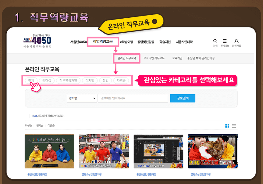 서울런4050은 설립 취지에 맞게 중장년의 이직, 전직, 창업을 목적으로 1000개가 넘는 고퀄리티의 직업역량교육 강의가 존재합니다.